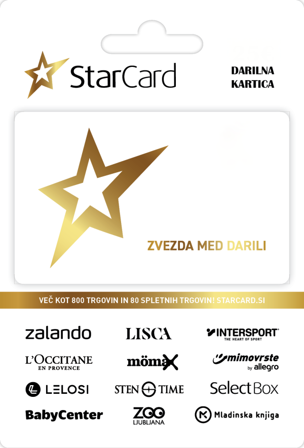StarCard je ime za darilne kartice, s katerimi podarite najlepše darilo, svobodo izbire! So edine darilne kartice, ki jih lahko v treh različnih vrednostih kupite preko spleta in koristite pri več kot 250 ponudnikih. Celotno skupino sestavlja 16 različnih kartic. Privoščite svojim najdražjim popolno darilo, ki ga lahko vnovčijo po lastnih željah.