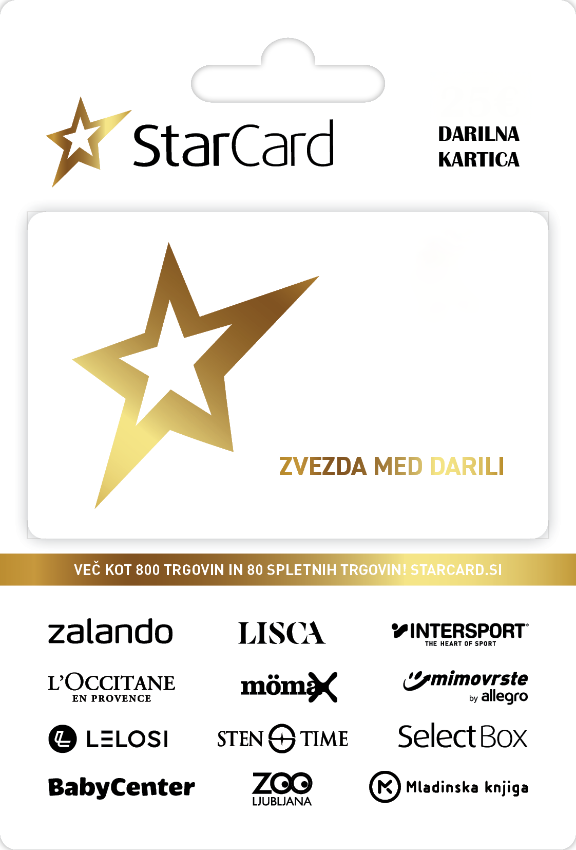 StarCard je ime za darilne kartice, s katerimi podarite najlepše darilo, svobodo izbire! So edine darilne kartice, ki jih lahko v treh različnih vrednostih kupite preko spleta in koristite pri več kot 250 ponudnikih. Celotno skupino sestavlja 16 različnih kartic. Privoščite svojim najdražjim popolno darilo, ki ga lahko vnovčijo po lastnih željah.